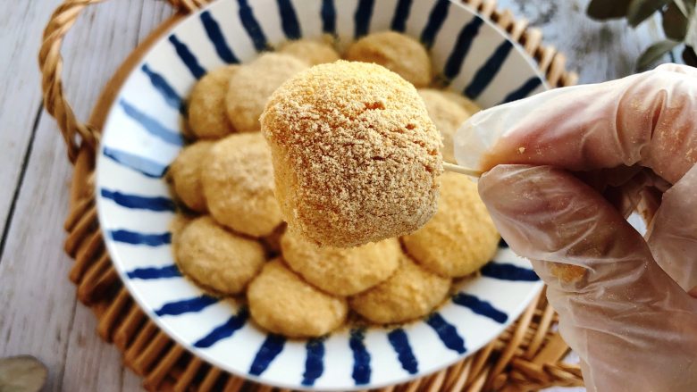 9. 把糯米团裹上黄豆粉,糍粑就做好啦!