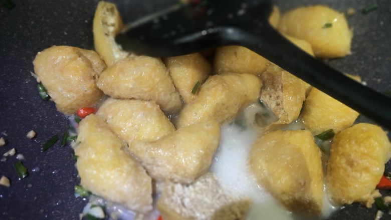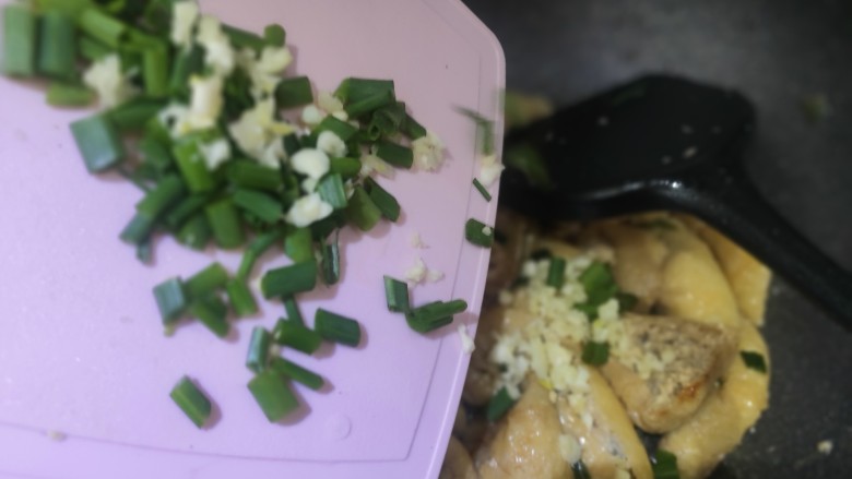素炒豆泡(油豆腐),加入备用的蒜粒和葱粒
