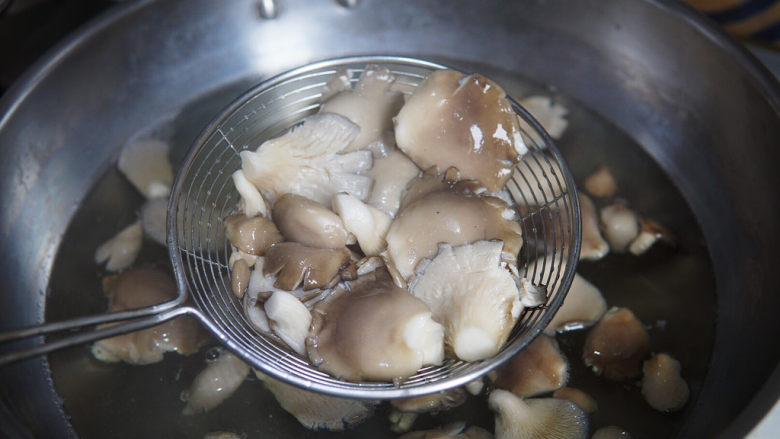 10. 洗净的平菇入锅焯烫至水再次沸腾,捞出,控水