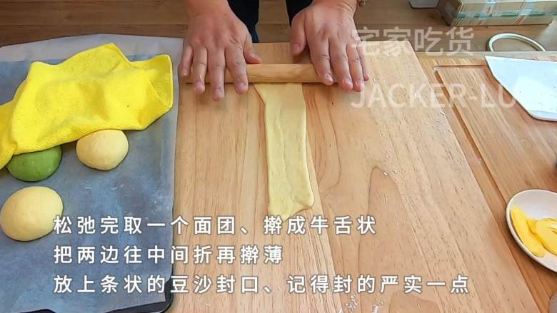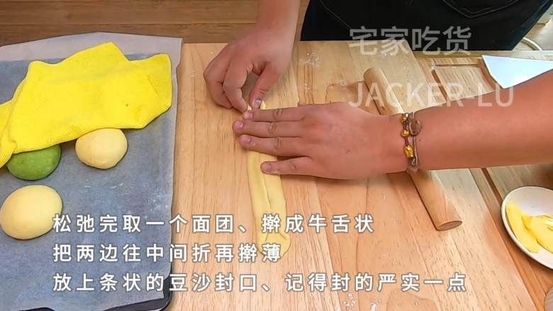 9. 松弛完以后,取一个面团,用擀面杖排气,擀成牛舌状。