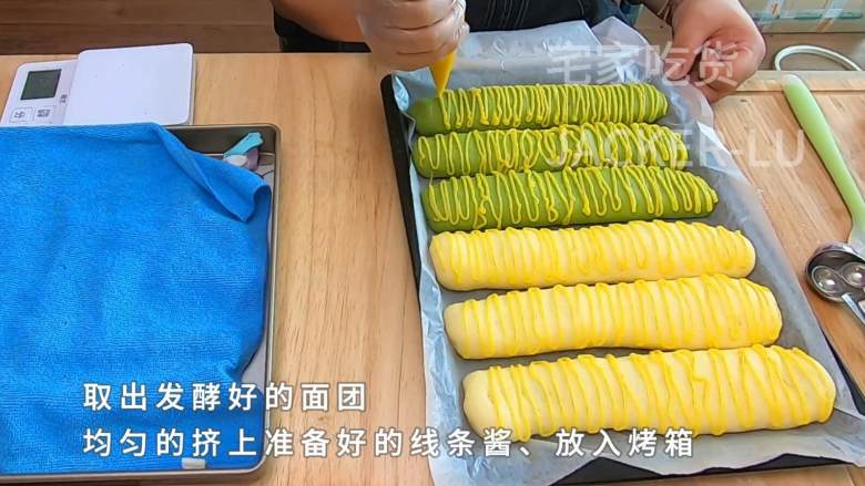 19. 取出发酵好的面团,均匀的挤上准备好的线条酱,放入烤箱。