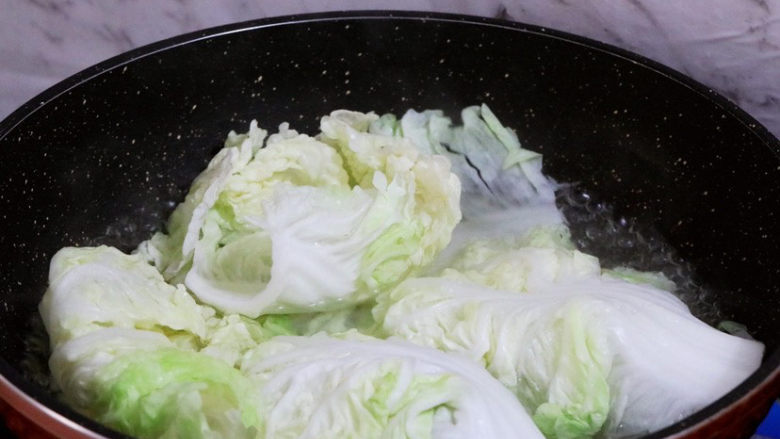 5. 锅中烧开水,放入白菜煮至变软,夹起白菜杆会弯曲即可