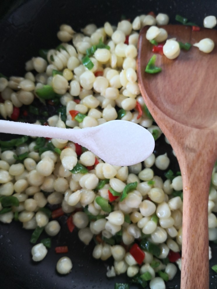 12. 放入玉米粒炒至断生