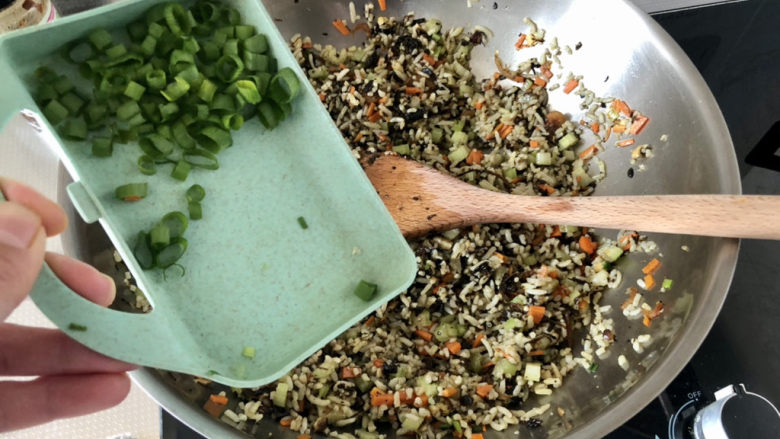 22. 加入橄榄菜,中大火,翻炒一分钟,翻炒到米饭食材粒粒均匀
