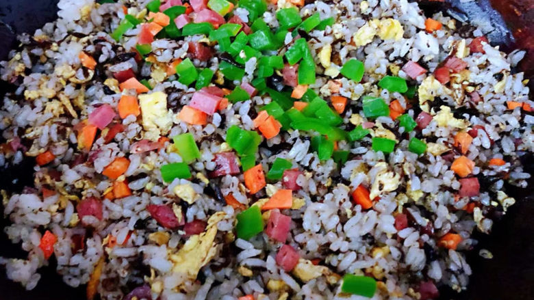6. 放入香肠、胡萝卜丁大火快速翻炒