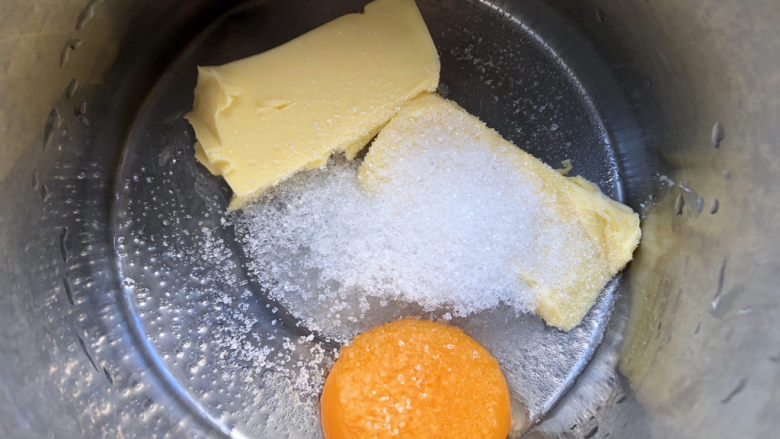 2. 先做挞皮,蛋黄黄油和细砂糖打发。