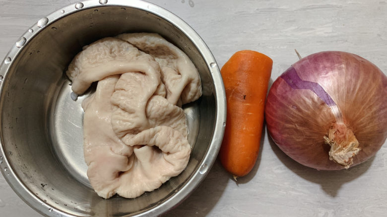 2. 肥肠提前洗净,入热水中烫一烫(不宜过久,不然影响口感)