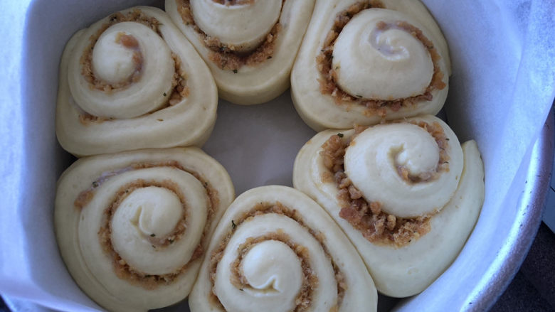 12. 三个分别卷好盖保鲜膜再次醒发15分钟。