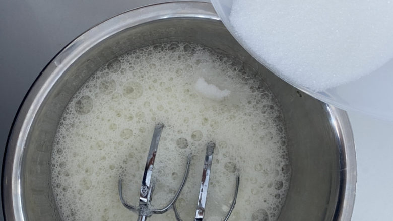 3. 第二次在蛋白气泡较绵密时加入,然后一直打,打到糖化,过程大概5分钟左右,具体还要看打蛋器的功率而定