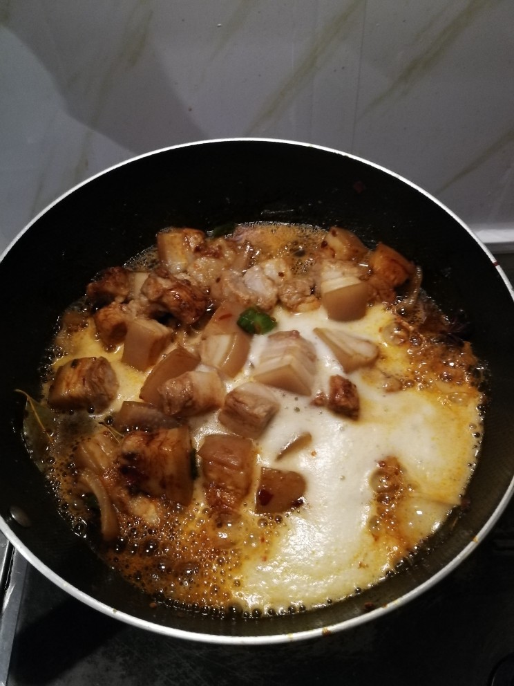 14. 大火烧开转中小火将肉炖熟,中间勤于翻拌。