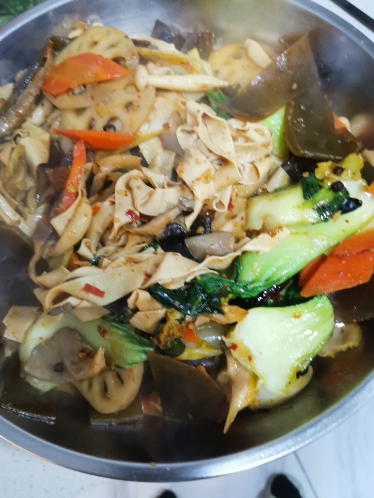 - 加了火锅底料,和酱油就很咸了,所以不用加盐,不爱熟的菜,都已经焯水了,所以大火翻炒一会就熟了
