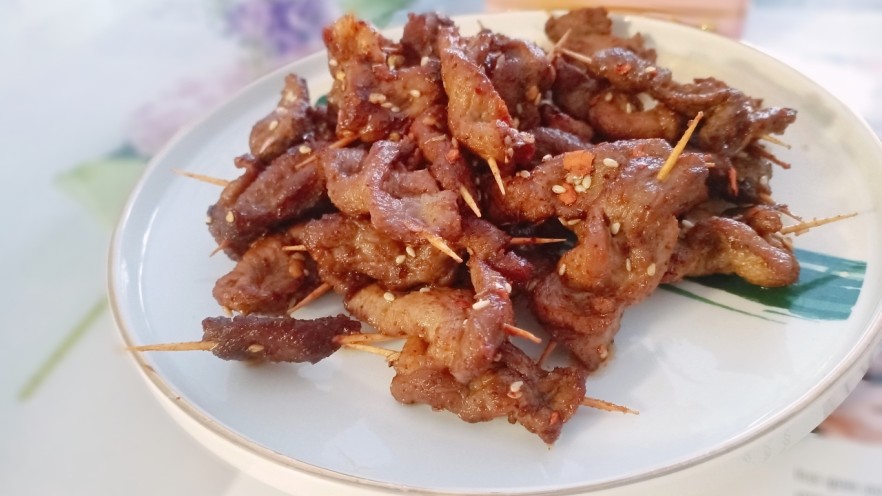 11. 把牙签肉分次下锅炸金黄捞出。再复炸,使羊肉外酥里嫩。