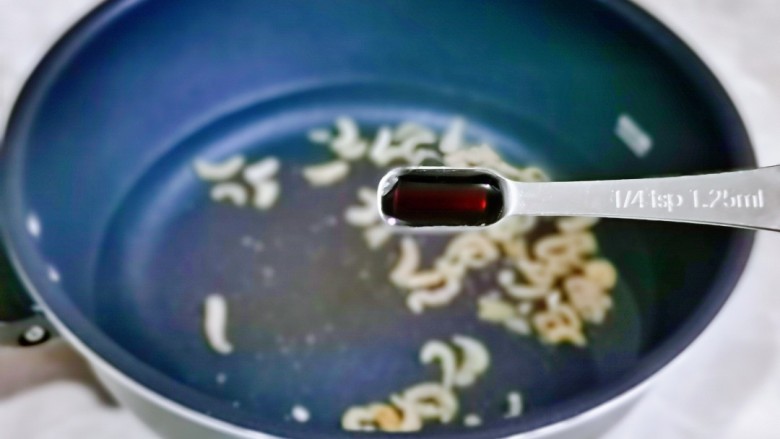 7. 锅中加入一小碗纯净水,再加入腌制好的虾米。