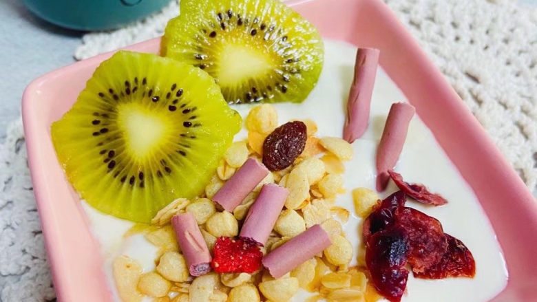 11. 放入猕猴桃、蔓越莓干。撒上燕麦脆