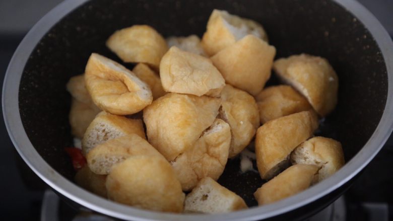 14. 煮至豆腐充分的吸饱汤汁后大火翻炒收汁