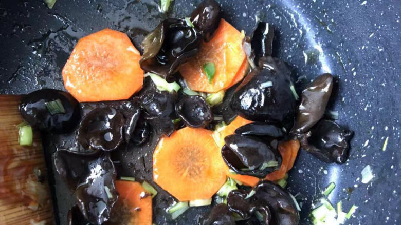 8. 接着放入胡萝卜黑木耳翻炒断生。