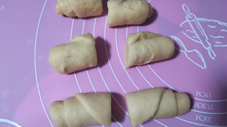 10. 用擀面杖擀成长条再卷起,对半切开