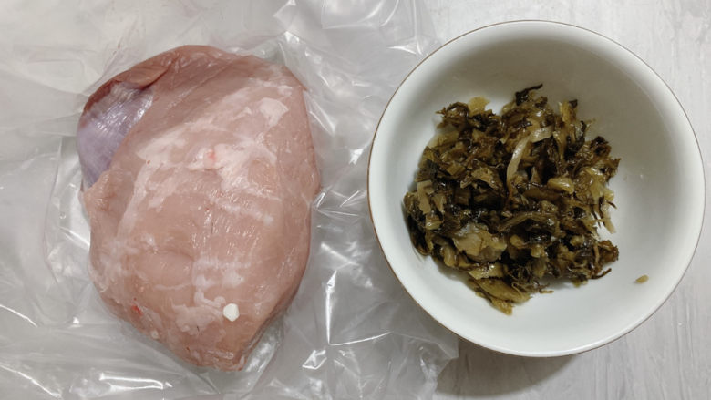 1. 主要食材如图所示示意,腌制好的雪菜、猪肉。