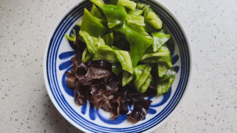 5. 青椒去蒂去籽,洗净之后切成小块,泡发好的黑木耳去蒂,洗净之后撕成小朵
