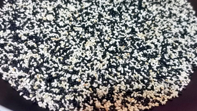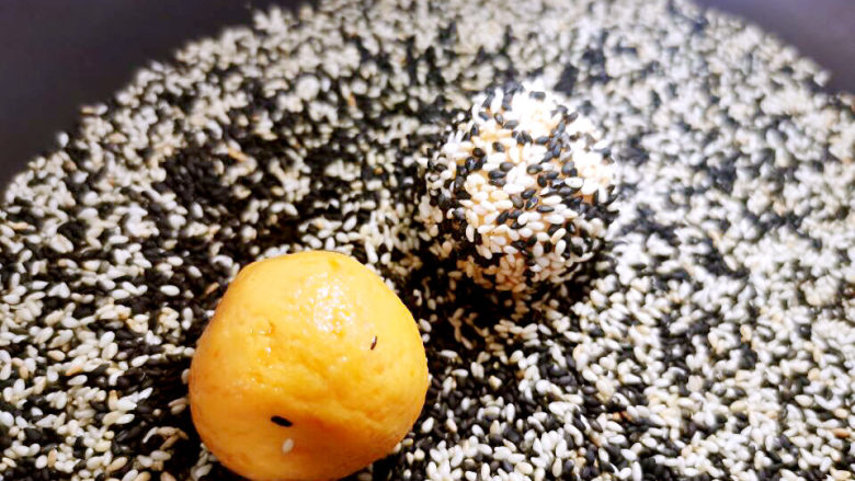 - 芝麻使用前一定要炒过才香。家中用油量不大,油炸只能一面一面来。地瓜丸子生胚沾水,更容易粘上芝麻