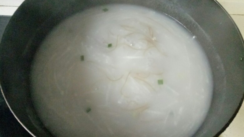 11. 面粉放入碗中,加入适量清水搅拌成面水倒入锅中煮开,加入泡软的粉丝