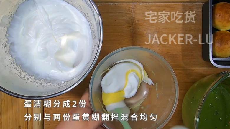 6. 抹茶浆加入一份蛋黄糊中搅拌均匀备用。