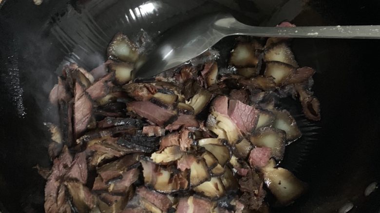 25. 翻炒均匀,适当加入味精或是食盐,因为腊肉本身有盐了,要记得尝了咸淡再选择要不要加盐。