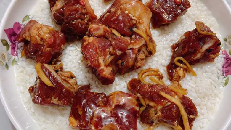 排骨抓好赤酱入味,平铺在米饭之上,肉香融入米粒,米粒含有鲜香~