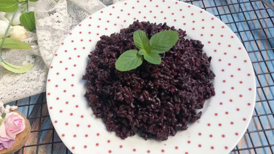 7. 蒸好的紫米饭里,放入椰子油、炼乳、糖和盐。