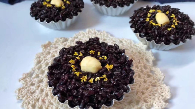 16. 做法三:把紫米馅填在模具里,嵌入一个莲子,撒一圈干桂花,再蒸热一下,做成紫米盏。