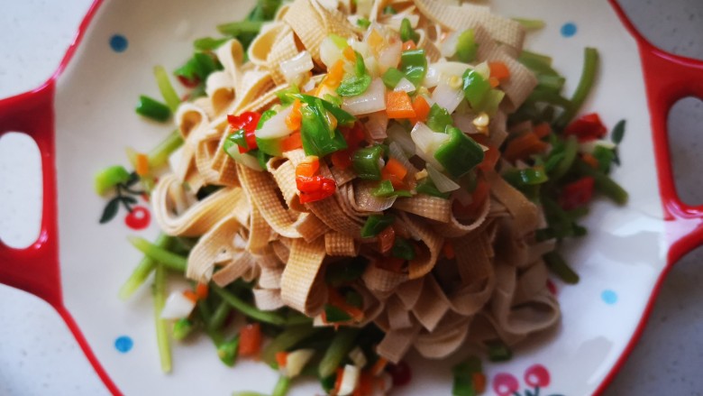 茼蒿气味芳香,营养丰富,有安心气,养脾胃,消痰饮,利肠胃的功效。茼蒿拌千张是一道简单的凉拌菜,开胃又下饭。