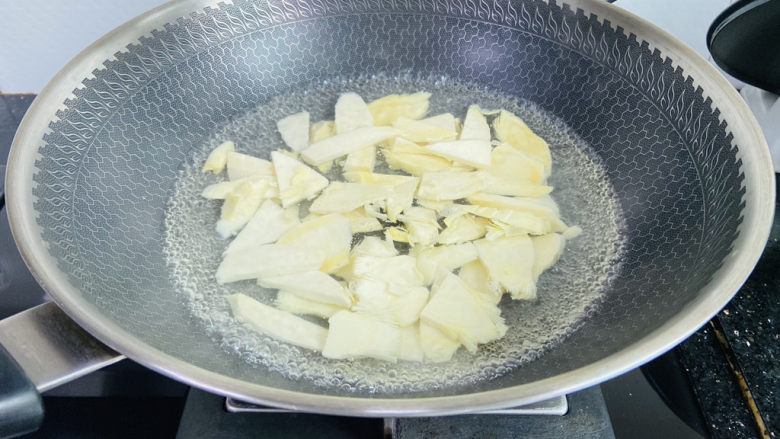 4. 放入冬笋加入少许盐焯烫3-5分钟