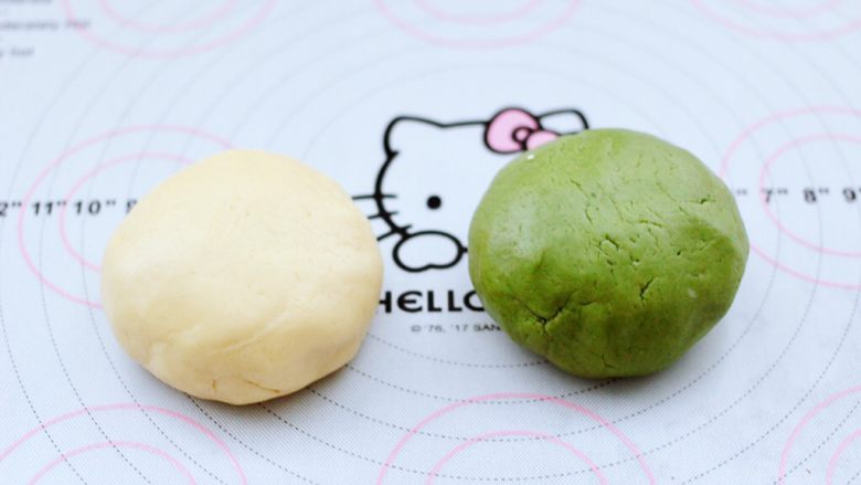 9. 用硅胶刀翻拌均匀,揉成面团,取一半面团加入抹茶粉揉成绿色的面团,把两块面团盖上保鲜膜放入冰箱冷藏半小时。