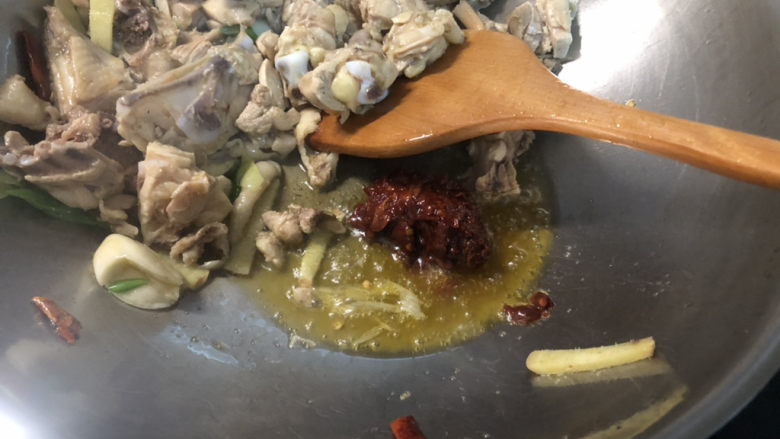 16. 鸡块推到锅边,加入一汤匙郫县豆瓣酱,小火煸炒出红油,再跟鸡块翻炒均匀