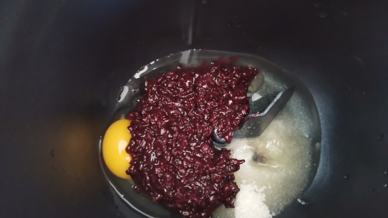 6. 再加入温水放入面包机启动揉面程序36分钟,因为紫米馅中含有水分,所以揉面的时候最后加入温水,水可以预留一部分,看面团的成形情况酌情添加。