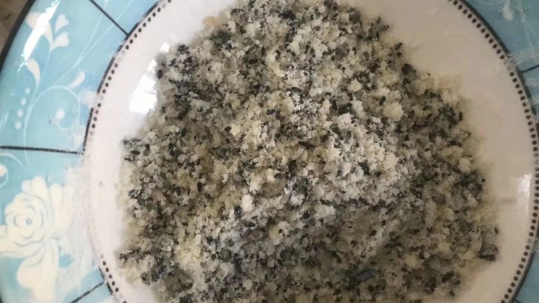 10. 趁面团松弛的时候来做脆底,碗中加入糖,油,黑芝麻,面粉,用手搓均匀