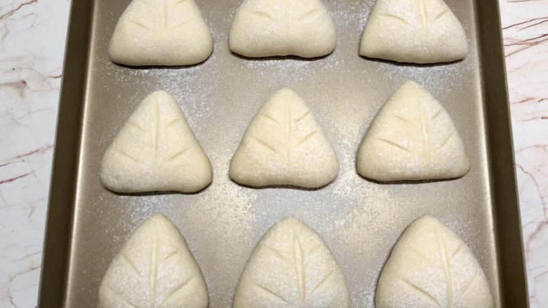 12. 直接发酵至接近2倍,取出割出花纹,撒上高粉
