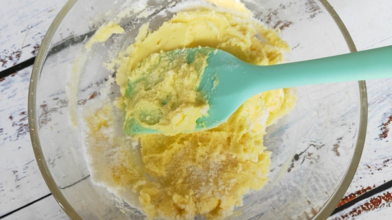 4. 用硅胶刮刀将黄油和糖粉搅拌均匀(搅拌均匀主要是为了等下打发时糖粉就不会溅的到处都是)