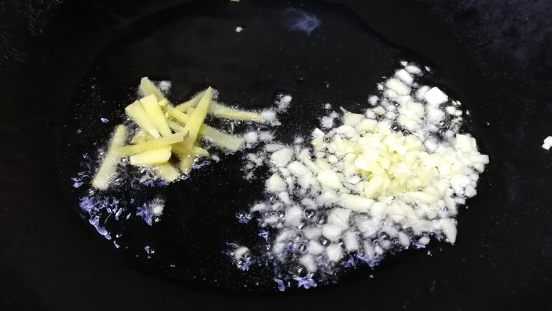 8. 热锅凉油,油温热放入蒜末和姜丝炒香。