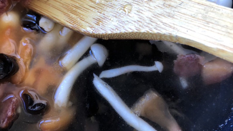 12. 接着放入白玉菇、黑木耳和香肠翻炒断生。