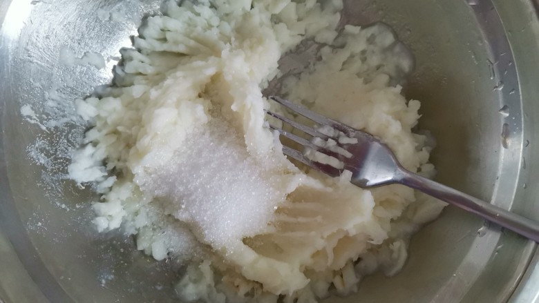 5. 上锅蒸熟后压成泥,加入白砂糖搅拌均匀