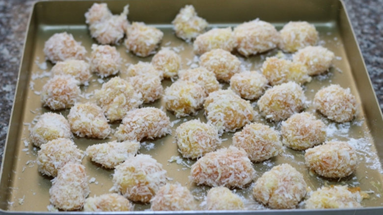 6. 腌制好的鸡肉丁蘸一层全蛋液后滚一层面粉,再蘸蛋液,然后裹上面包糠