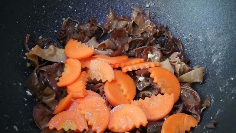 14. 加入胡萝卜,炒至胡萝卜断生