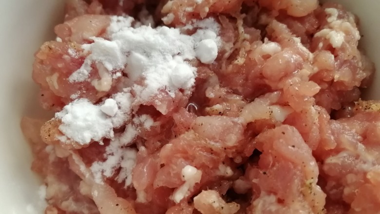 3. 肉馅里加适量黑胡椒粉,盐拌匀入味增香。