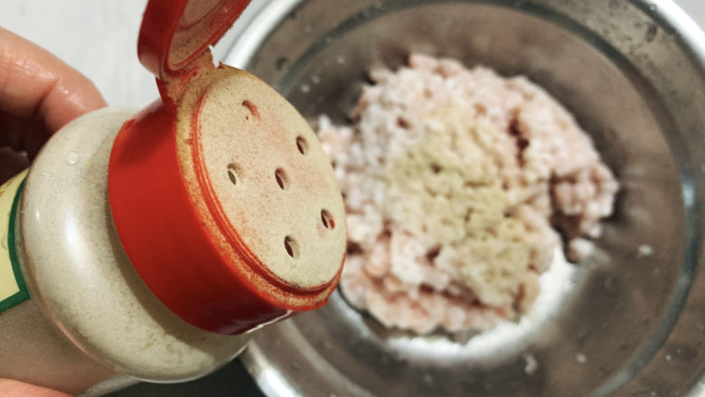 2. 买好现成的肉沫,肥瘦相间的为好,加入适量胡椒粉去腥