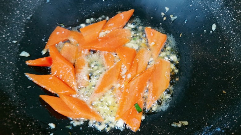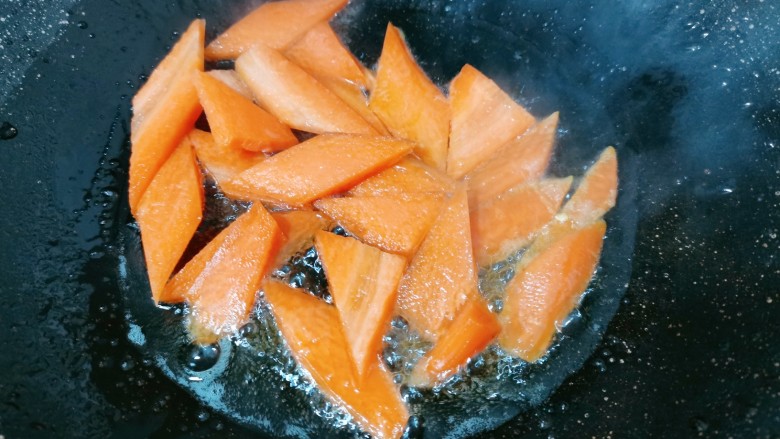 8. 锅里烧油,先把红萝卜放入煸炒一下