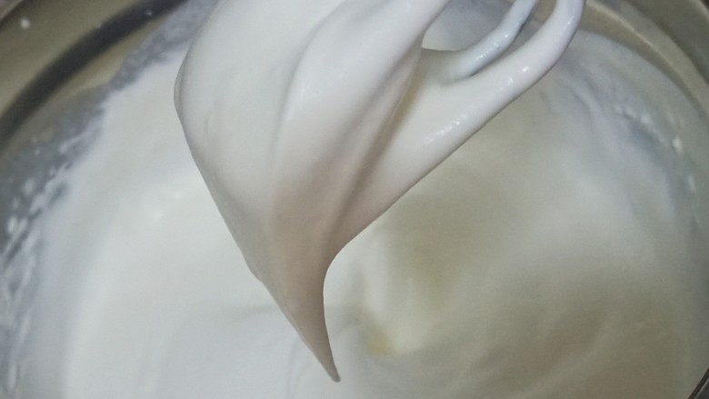6. 再来打发蛋白。蛋清分3次加入细砂糖打发。打到湿性发泡后再打发几秒钟即可。提起打蛋头,有大弯钩。不要打发太干了,吃起来不绵软