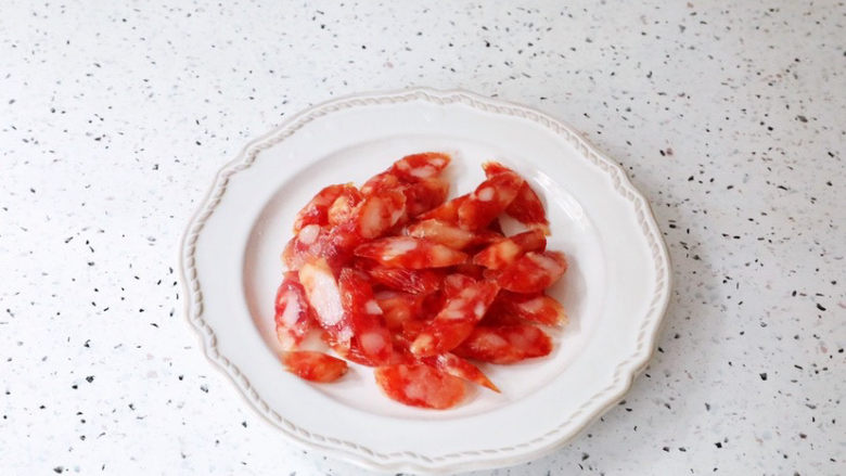 7. 原锅倒入少许食用油烧热,放入腊肠