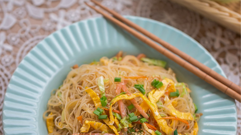 于广东人而言,我觉得炒米粉跟干炒牛河的地位是不分伯仲的,而从小到大,炒米粉之于我家传统这宴席的重要性,就跟“无鸡不成宴”一样。 小时候,衡量一桌酒席是否丰盛,要看一有没有鸡,二有没有炒米粉。 逢年过节、乔迁、结婚、满月等酒宴,一桌人围坐好,菜品上得七七八八时,最后出场的必是那盘超大的米粉,一般用30*15CM左右的椭圆形纯色或花纹陶瓷猪腰盘盛着。 盘里的米粉就像一条条长长的线凌乱又乖巧地缠绕着,白里带着少许的酱油黄,上面洒着一层白芝麻,芝麻上面淋着一层由虾米、大白菜丝和胡萝卜丝炒成的芡汁。 随着厨师端着从桌子外围送进来,冒着热浪的香气瞬间传遍在桌的每个人,顿时垂涎欲滴,至此宴席真正开始了,众人的手齐刷刷伸向这盘千呼万唤方出来的佳肴。 多年来,在外面吃过无数的干、湿炒牛河,或蛋、肉炒米粉,但从来没有遇到过那种儿时记忆的卖相和味道,逢年过节即使是家里人做的菜,也很少再见那道米粉的身影,因为生活条件发生改变,很多美味佳肴有更好的条件去展现,也有更多丰富的调配方式,可是我始终怀念芝麻的嚼感和虾米芡汁的味道。 但下厨这么多年,自己却未曾COPY过那记忆中的味道,因为嫌麻烦,都是直接干炒,庆幸的是也慢慢炒出了喜欢的味道,或加肉丝,或加蛋,再配以蔬菜,最后不可或缺的是酱油和葱,我觉得这是炒米粉的灵魂。