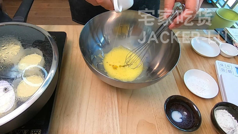 7. 加入温牛奶200克,加入蛋液中搅拌均匀。